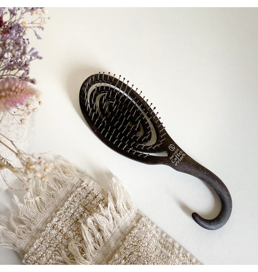 - Made from recycled coffee grounds and plastic. Flexible head design allows you to detangle your hair as smoothly and quickly as possible, wet or dry. Anti-tugging nylon bristles with protective ball . Handle with hook for convenient hanging.