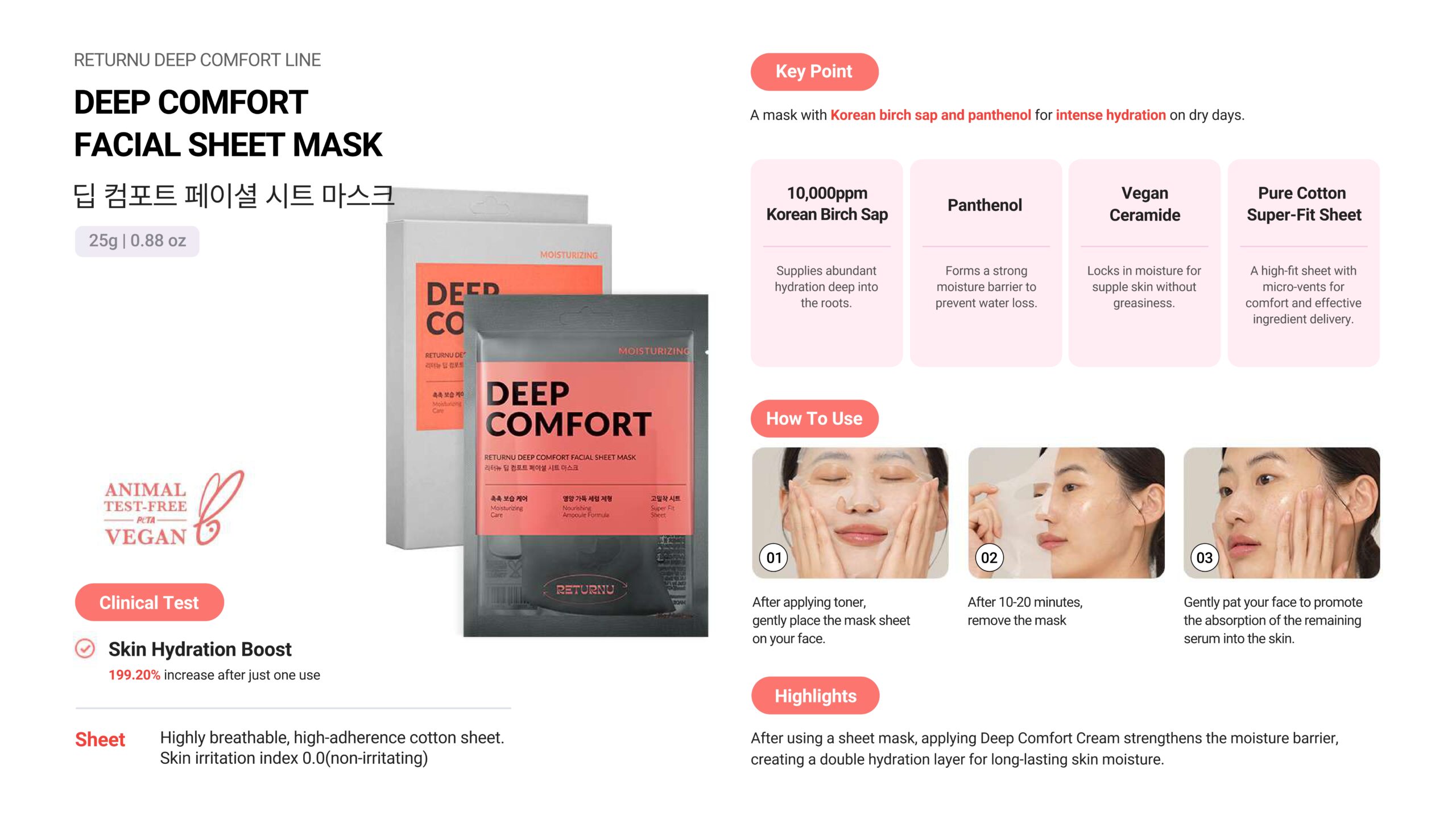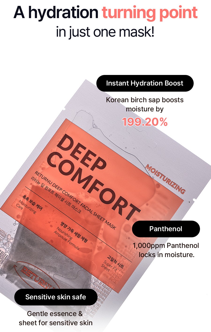 This sheet mask combines panthenol, vegan ceramide, and a deeply hydrating essence to deliver intense moisture while supporting the skin’s natural barrier.💧 [Deep & Long-Lasting Hydration]