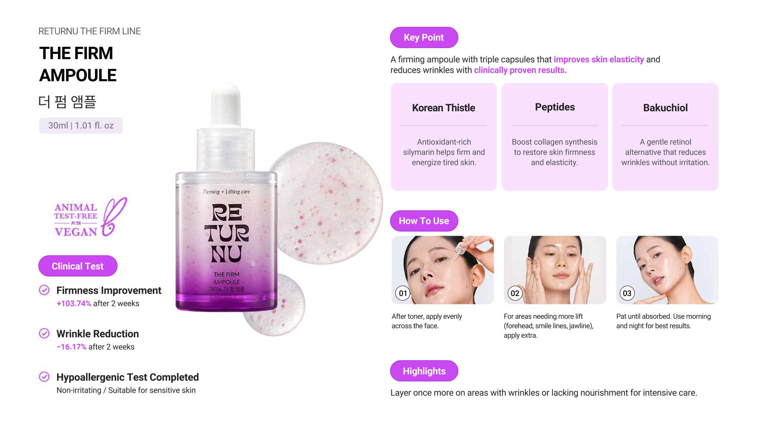 A firming ampoule with triple capsules that improves skin elasticity and reduces wrinkles with clinically proven results.