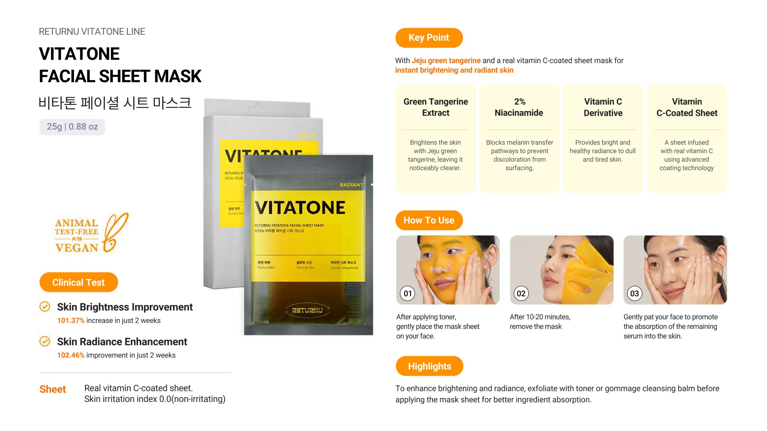 This facial sheet mask features a vitamin C-coated sheet that delivers active ingredients directly to the skin for enhanced skincare performance.🍊 [Hydration with Jeju Green Tangerine & Niacinamide]